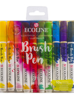 This set contains 10 Ecoline Brush pens inillustration inspired colour palette. The Brush Pen is characterized by its flexible tip and extensive range of brilliant colours thanks to its pure, dye-based formula. The transparent colours offer the best results when used on white or very light-coloured paper. If you wish, you can easily decrease the colour intensity through thinning with water or using the Brush Pen blender. These pens are perfect for hand lettering, watercolour drawings, quick sketches and finishing touches.