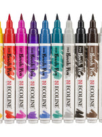 This set contains 10 Ecoline Brush pens in n various vivid shades, perfect for hand lettering. The Brush Pen is characterized by its flexible tip and extensive range of brilliant colours thanks to its pure, dye-based formula. The transparent colours offer the best results when used on white or very light-coloured paper. If you wish, you can easily decrease the colour intensity through thinning with water or using the Brush Pen blender. These pens are perfect for hand lettering, watercolour drawings, quick sketches and finishing touches.