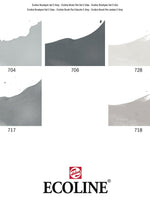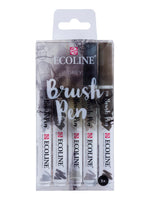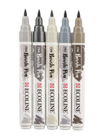 This set contains 5 Ecoline Brush pens in vivid grey shades. The Brush Pen is characterized by its flexible tip and extensive range of brilliant colours thanks to its pure, dye-based formula. The transparent colours...