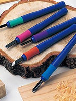 A set of 5 carving chisels with rubber handle for a non-slippery comfortable grip. · Shapes included: V-parting chisel, straight gouge chisel small, straight gouge chisel large, skewed chisel & straight chisel · Rubber grip...