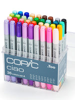 This 36A Ciao set includes a majority of violets and greens with a good amount of primary colours. All of these colours blend harmoniously together. This is a great way to get started with Copic! This set includes vivid colours with a wide variety of greens and purples. The entire range of 180 Copic Ciao colours can be completed by combining the 36 colour sets A, B, C, D and E.