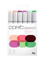 This 6 piece set includes rosy colours with a splash of yellow-green: R01, RV13, RV69, V05, YG41, and YG45. This set is a great way to begin adding floral colours to your Copic collection.