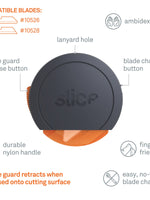 · Finger-friendly® blade is the only safety blade on the market · Circular ergonomic handle fits comfortably in your palm · Blade only exposed when you press textured button and push tool into cutting surface...