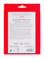 Basic set of 12 fineliners / brush pens. Perfect for urban sketching, hand lettering, bullet journalling, brush lettering and drawing. Dual point - Brush tip for thick & thinner lines & 0.4 mm durable fibre nib for details. 12 basic colours. Water-based ink.