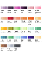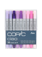 This 36A Ciao set includes a majority of violets and greens with a good amount of primary colours. All of these colours blend harmoniously together. This is a great way to get started with Copic! This set includes vivid colours with a wide variety of greens and purples. The entire range of 180 Copic Ciao colours can be completed by combining the 36 colour sets A, B, C, D and E.
