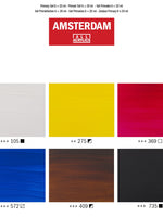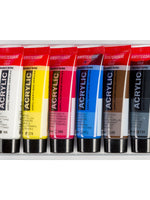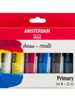 This set contains 6 x 20 ml tubes of acrylic paint in primary colours for you to start your colour palette with. This set contains all three primary colours with the addition of Titanium White, Burnt Umber and Oxide Black to create a complete basic colour palette.