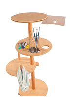 Product description: · MULTILEVEL ARTIST SUPPORT · Costructed of oiled beechwood/ plywood · 2 adjustable shelf and one fixed for holding painting accessories · Top shelf with palette support · Middle shelf with 2 holes...