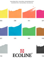 This set contains 10 bottles of Ecoline liquid watercolour ink in various bright colours. The round Ecoline bottles are stable and have a wide opening, so you can work straight out of the bottles using a brush or pen. Additionally, the bottles are fitted with a handy pipette that allow you to easily dose Ecoline into mixing trays or straight onto your artwork. The transparent colours offer the best results when used on white or very light-coloured paper.