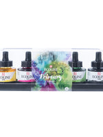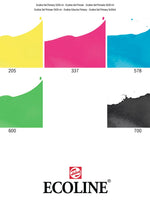 This set contains 5 bottles of Ecoline liquid watercolour ink in the primary colours, with added green and black to create a basic colour palette. The round Ecoline bottles are stable and have a wide opening, so you can work straight out of the bottles using a brush or pen. Additionally, the bottles are fitted with a handy pipette that allow you to easily dose Ecoline into mixing trays or straight onto your artwork. The transparent colours offer the best results when used on white or very light-coloured paper.