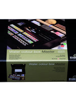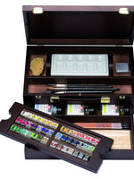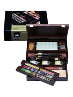 This master wooden box set includes 42 watercolour paint pans in the following colours: Chinese White (108), Transparent Titanium White (112), Naples Yellow Red (224), Gold Ochre (231), Gamboge (238), Indian Yellow (244), Permanent Lemon Yellow (254), Permanent Orange (266), Azo Yellow light (268), Azo Yellow Medium (269), Azo Yellow Deep (270), Permanent Madder Purple Light (321), Permanent Madder Purple (325), Permanent Madder Lake (336), Light Oxide Red (339), Permanent Red Light (370), Permanent Red Deep (371), Permanent Red Medium (377), Raw Umber (408), Burnt Umber (409), Burnt Sienna (411), Sepia (416), Ultramarine Deep (506), Ultramarine Violet (507), Prussian Blue (508), Cobalt Blue Amar (512), Turquoise Blue (522), Mauve (532), Indigo (533), Cerulean Blue (Phthalo) (535), Phthalo Blue Greenish (576), Indanthrene Blue (585), Emerald Green (615), Olive green (620), Sap Green (623), Permanent Yellowish Green (633), Hooker Green Deep (645), Permanent Green (662), Phthalo Green (675), Lamp Black (702), Paynes Grey (708).