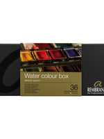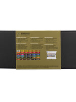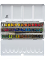 Includes 36 watercolour paint pans in the following colours: Opaque white (106), Cadmium yellow lemon (207), Cadmium orange (211), Yellow ochre (227), Gamboge (238), Aureoline (242), Azo yellow light (246), Azo yellow deep (248), Azomethine green yellow (296), Cadmium red (305), Cadmium red deep (306), Vermilion (311), Carmine (318), Permanent madder lake (336), Perylene red deep (354), Quinacridone rose (366), Burnt umber (409), Greenish umber (410), Burnt sienna (411), Sepia (416), French ultramarine (503), Ultramarine deep (506), Prussian blue (508), Cobalt blue (511), Turquoise blue (522), Mauve (532), Cerulean blue (534), Blue violet (548), Indanthrene blue (585), Viridian (616), Olive green (620), Sap green (623), Hooker green deep (645), Permanent green (662), Ivory black (701), Payne's grey (708). All colours in this general colour selection set have the highest lightfastness rating of +++ (100+ years under museum conditions). This set also includes a brush.
