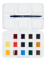 Colours in this shades of nature set are: Chinese White 108, Permanent Lemon Yellow 254, Azo Yellow Medium 269, Permanent Red Light 370, Madder Lake Deep 331, Ultramarine Deep 506, Cerulean Blue Phthalo 535, Sap Green 623, Viridian 616, Burnt Sienna 411, Yellow Ochre 227, Payne's Grey 708, plus BONUS pans Quinacridone Rose 366, Prussian Blue 508, Burnt Umber 409. Also includes a round synthetic hair brush size 6 and a mixing tray.