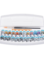 This specialty selection includes metallic and interference colours: Silver 800, Light Gold 802, Deep Gold 803, Copper 805, Bronze 811, Graphite 840, Interference White 843, Interference Yellow 844, Interference Red 845, Interference Blue 846, Interference Violet 847, Interference Green 848. Also includes a round synthetic hair brush size 6 and a mixing tray.