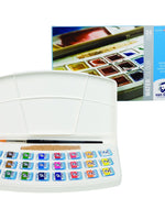Colours in this general selection set are: Chinese White 108, Yellow Ochre 227, Gamboge 238, Permanent Lemon Yellow 254, Permanent Orange 266, Azo Yellow Light 268, Azo Yellow Deep 270, Vermillion 311, Madder Lake Deep 331, Quinacridone Rose 366, Permanent Red Light 370, Permanent Red Deep 371, Burnt Umber 409, Burnt Sienna 411, Sepia 416, Ultramarine Deep 506, Prussian Blue 508, Cobalt Blue Ultramarine 512, Cerulean Blue Phthalo 535, Viridian 616, Sap Green 623, Hooker Green Deep 645, Permanent Green 662, Payne's Grey 708. Also includes a round synthetic hair brush size 6 and a mixing tray.