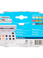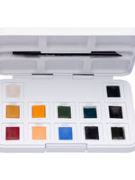 Colours in this muted selection set are: Titanium Buff 291, Naples Yellow Red 224, Gamboge 238, Yellow Ochre 227, Quinacridone Rose 366, Olive Green 620, Davy's Grey 748, Turquoise Green 661, Lavender 525, Indigo 533, Neutral Tint 715, Sepia 416. Also includes a round synthetic hair brush size 6 and a mixing tray.