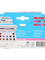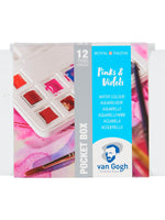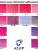 Colours in this pinks and purples selection set are: Carmine 318, Madder Lake Light 327, Madder Lake Deep 331, Rose 357, Quinacridone Rose 366, Dusk Pink 373, Lavender 525, Dusk Violet 560, Permanent Red Violet 567, Permanent Blue Violet 568, Quinacridone Purple Red 592, Quinacridone Purple Blue 593. Also includes a round synthetic hair brush size 6 and a mixing tray.