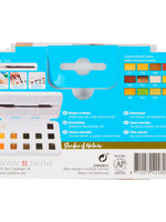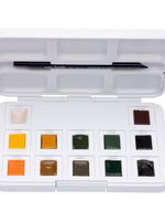 Colours in this shades of nature set are: Yellow Ochre 227, Raw Sienna 234, Raw Umber 408, Burnt Sienna 411, Burnt Umber 409, Vandyke Brown 403, Titanium Buff 291, Azo Yellow Medium 269, Permanent Orange 266, Sap Green 623, Olive Green 620, Azomethine Green Yellow 296. Also includes a round synthetic hair brush size 6 and a mixing tray.
