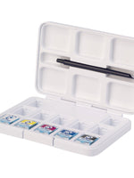 The pans come in a plastic pocket box with space for 12 half pans so you can add 7 other pans to create your own perfect colour palette. The convenient pocket box also includes a round synthetic watercolour brush (size 6) and a mixing tray.