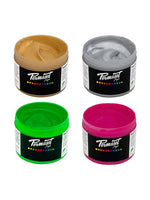 The Permaset Aqua mixed trial set contains 4 x 100ml in Gold/ Silver/ Glow Green & Glow Pink